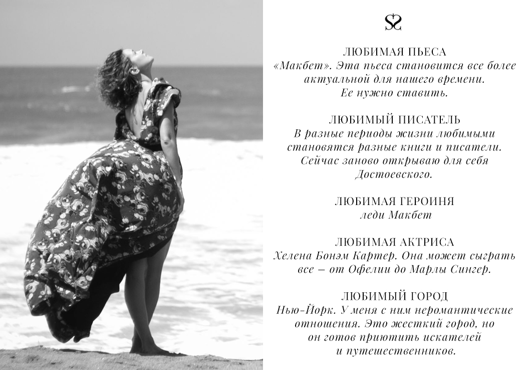 «Я бы очень хотела сыграть на русском языке! Чехов на английском звучит странно. То же самое с Шекспиром. Да, его прекрасно перевели, только это не Шекспир. Ведь в языке заложен особый музыкально-звуковой код»