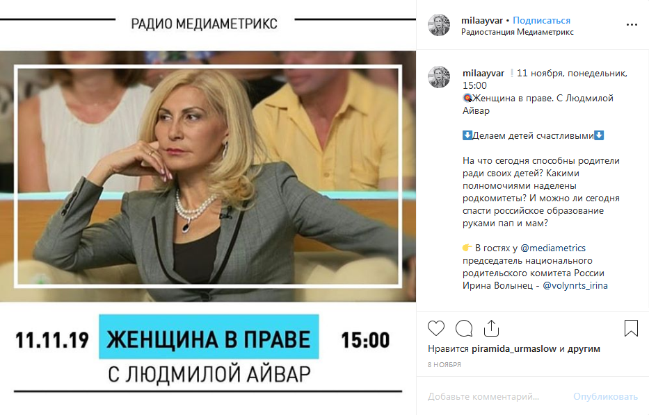 Она сотрудничает также и с радио: на радиостанции Медиаметрикс выходит ее программа «Женщина в праве. С экспертом Людмилой Айвар». В каждом выпуске этого проекта она разбирает до мелочей разные жизненные ситуации, объясняет, как нужно действовать и когда обращаться за помощью к стражам порядка.