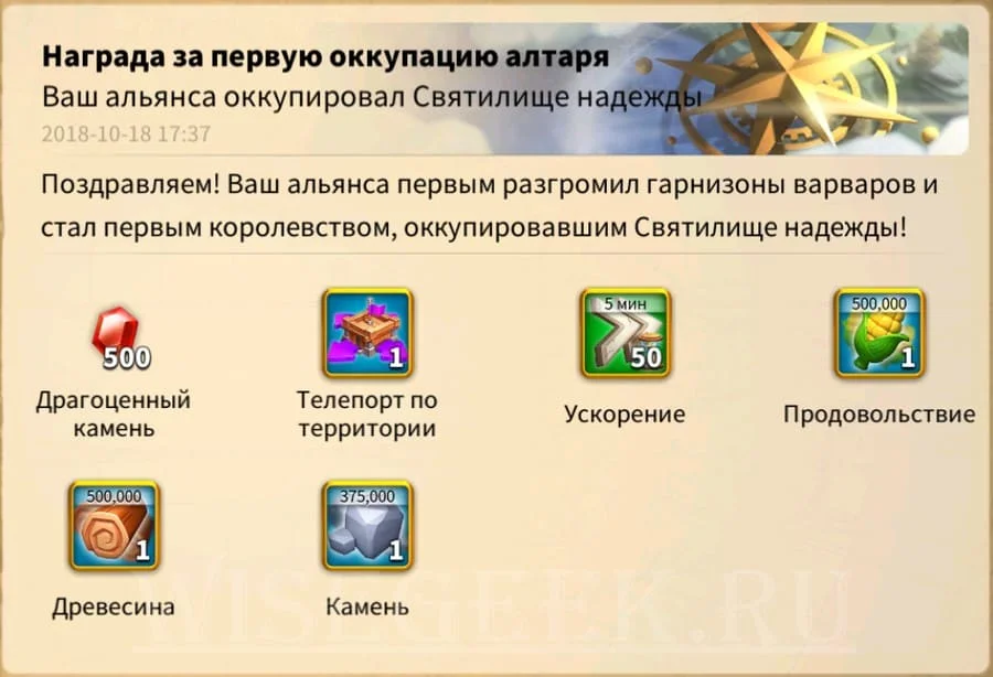 Во-вторых, в Альянсе можно совершать совместные нападения на варваров, форты, других игроков, святилища и т.д. За победу над этими врагами дают превосходные награды. Например награды за первую оккупацию святилища можно посмотреть на скриншоте. Собирать совместные атаки можно после постройки «Замка». Чем выше его уровень, тем больше братвы Вы сможете собрать для наезда на врагов. Причём награды за совместные атаки получат все участники атаки. Атака на члена альянса расценивается как атака на весь альянс, поэтому на подобные авантюры осмеливаются только нубы.