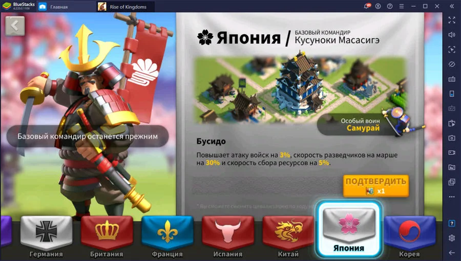 В самом начале пути вам предстоит определиться с конкретной стратегией предпочитаемого стиля ведения игры. К примеру, у Японии экспансионистская тактика: со старта атака войск увеличена на 2%, а скорость разведки на марше на 30% превышает базовое значения. Не сложно догадаться что уникальными полководцами страны Восходящего солнца будут самураи. Играя же, например, за Рим, вы получите бонусы к строительно-оборонительному стилю прокачки: защита пехоты базово увеличена на 5%, а сбор продовольствия имеет десятипроцентный бонус.