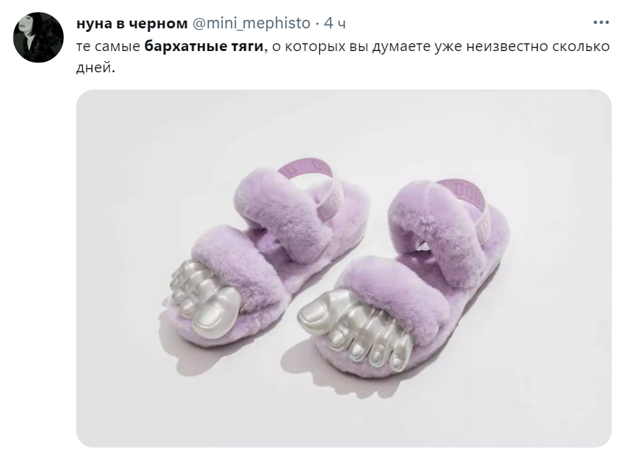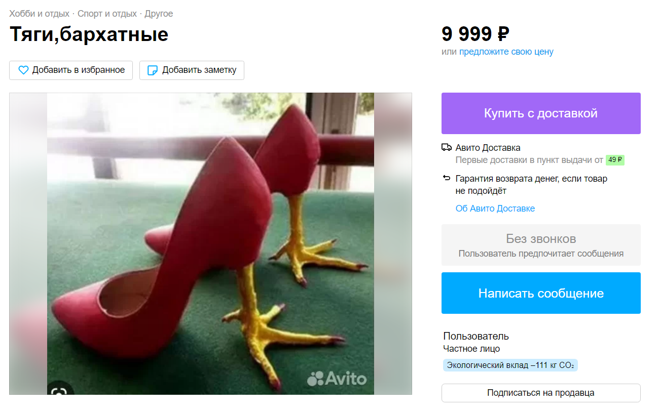В скором времени «бархатные тяги» стали распространяться на любую обувь вообще. Так пользователи называют свои обновки, обувь персонажей и даже товары, которые выставляют на Авито.