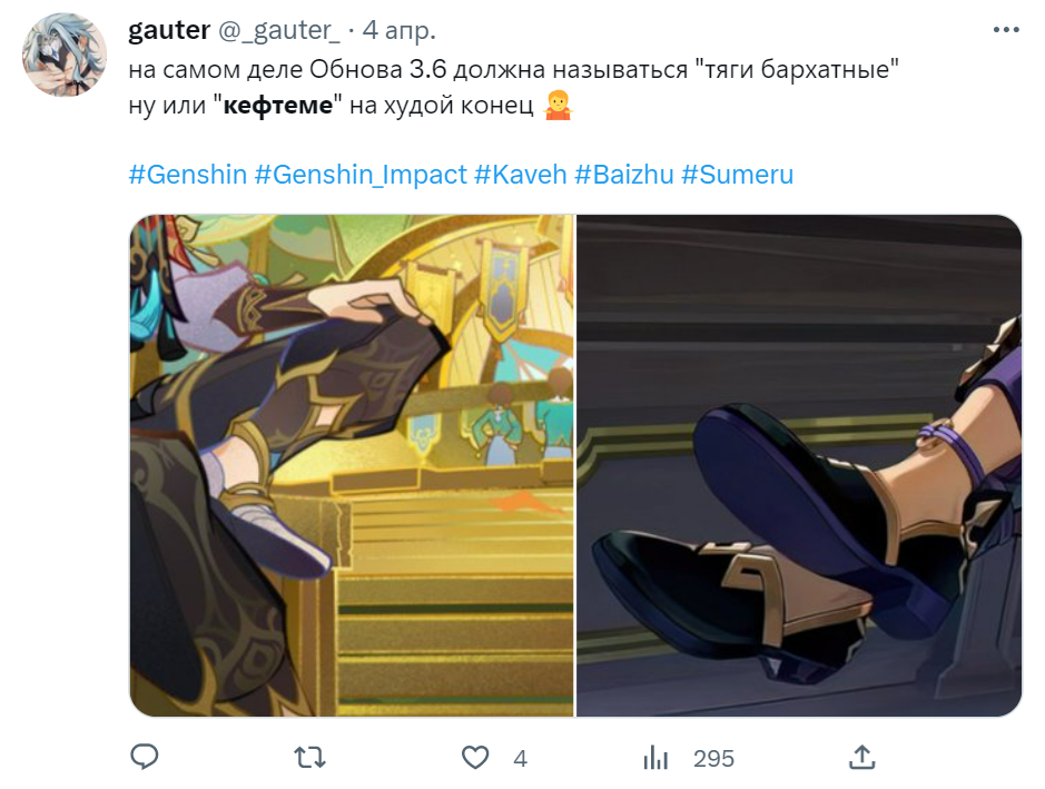 В большинстве случаев «кефтеме» используется вместе с другим мемом – «бархатными тягами». Как уже было сказано, эта фраза тоже взята из голосового сообщения. Она стала использоваться для описания вычурной и нелепой обуви. Например, так юзеры окрестили красные сапоги MSCHF, которые недавно примерил Хасбик.