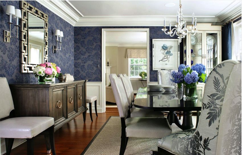 Покрытия синего цвета с ярко выраженным рисунком можно использовать в качестве декоративного элемента. Красивые обои в комнату, обрамленные в багетную рамку, будут исполнять роль настоящей картины, что впишется в классический интерьер. Стильно смотрится однотонное полотно насыщенного синего цвета, которое оформлено молдингами, и выделено на светлом фоне.