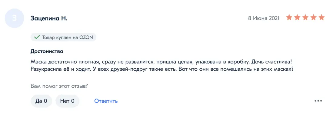 Судя по предложениям и отзывам на маркетплейсах, включая Ozon, Wildberries, «Яндекс.Маркет» и Aliexpress, спрос на маски действительно вырос. Чаще всего отзывы оставляют родители, которые заказывают маски своим детям.