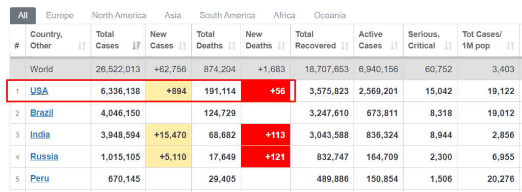 В США, где проживает всего 4% мирового населения, сегодня зарегистрирована одна четверть заражений. На удивление фондовый рынок эту статистику проигнорировал, также как и новости об экономическом состоянии страны. А именно — официальный уровень безработицы в США достиг 14.7%, а ВВП по итогам года должен упасть на более чем 30%. Однако фондовый рынок США после падения в феврале наоборот резко повернулся и вырос на 50%. Более того, индекс S&P 500 сегодня (даже после относительного падения) все равно находится близко к своему историческому максимуму (максимальный уровень индекса 3,386.15 был достигнут 19 февраля 2020 года, как раз перед обвалом).