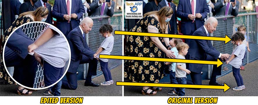 If you look closely, the girl appears to be “floating” above the ground because she was cropped out and moved upwards so that her shirt would cover Biden’s hand.
