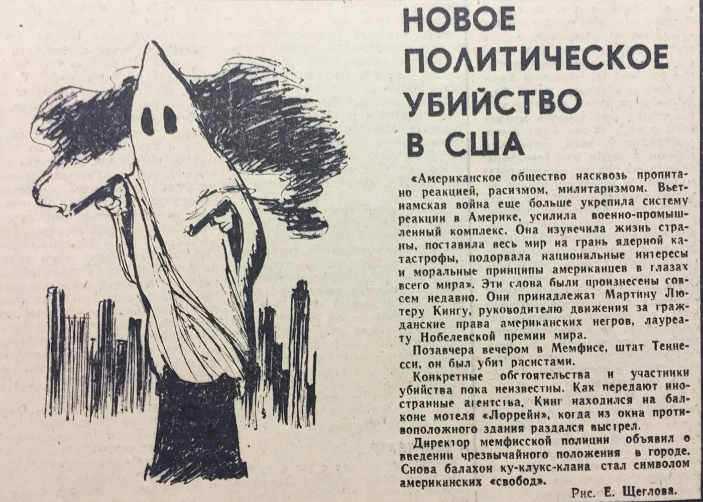 4 апреля 1968 года Кинг находился в Мемфисе, где поддерживал забастовку чернокожих рабочих. Он остановился в недорогом мотеле «Лорейн», который принадлежал его другу, также темнокожему. Выйдя вечером на балкон своего номера, Кинг был убит одним выстрелом из винтовки.