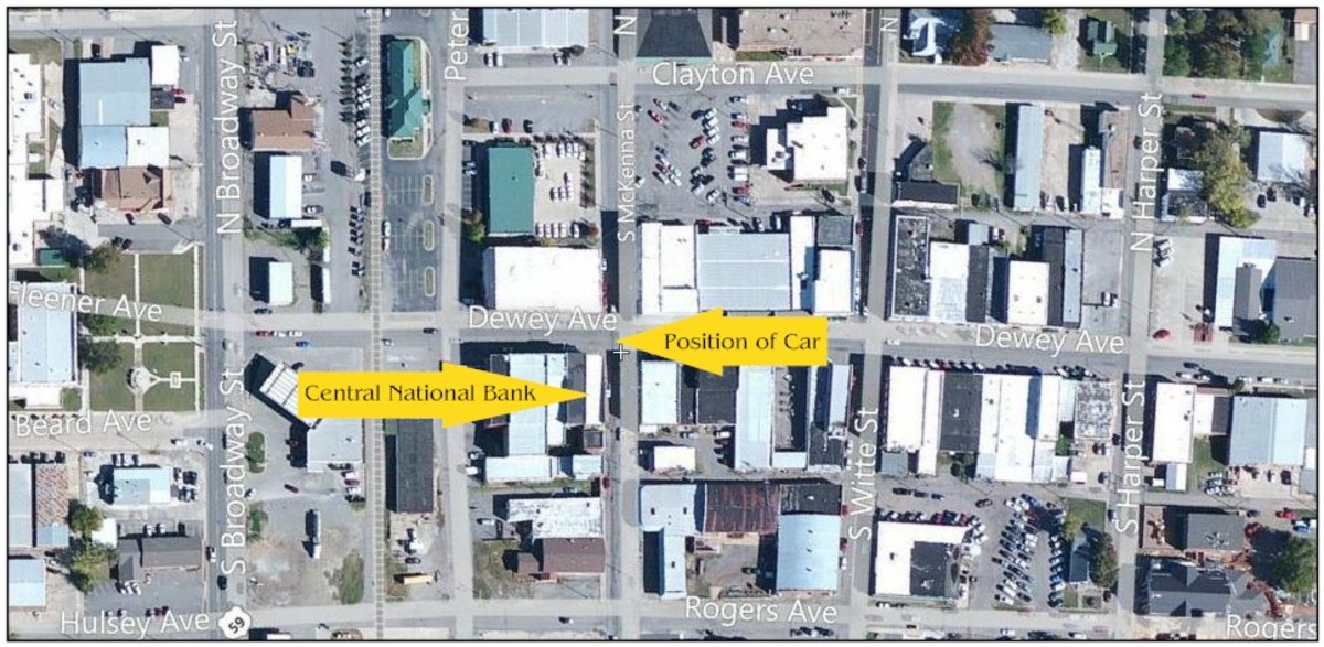 Снаружи у Дж. М. Батлера возникли подозрения, когда он увидел залитый грязью седан «Голубой Плимут», припаркованный на берегу. У машины было выбито заднее стекло. Батлер подумал, что пулемет, вероятно, был спрятан сзади. Это подозрение побудило Батлера схватить пистолет и войти в банк.