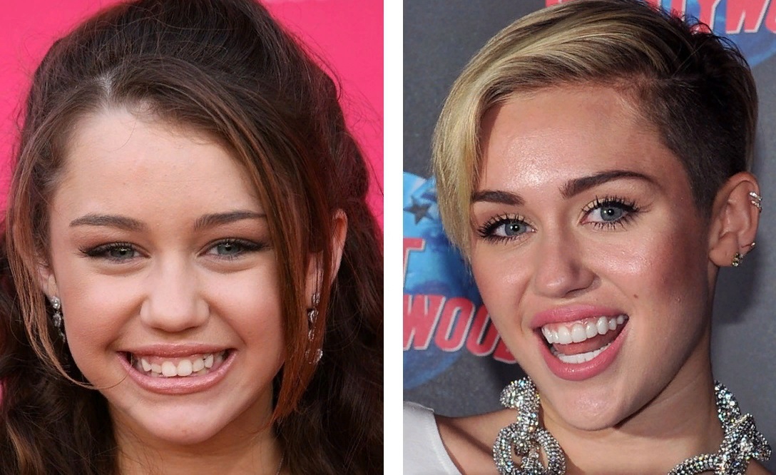 Став блондинкой с короткой стрижкой, Майли не расстается с ярко красной помадой, делающей ее губы соблазнительными, а образ в целом ярким и сексуальным. Кстати, прозвище «Майли» (от английского слова smile – улыбка) девушка получила в детстве за прелестную белоснежную улыбку. В то время небольшое «несовершенство» верхних резцов только добавляло ее образу очарования. Однако то, что хорошо для подростка, не годится для известной медийной персоны. Став популярной, Майли Сайрус решила избавиться от «особой приметы» и исправила прикус.
