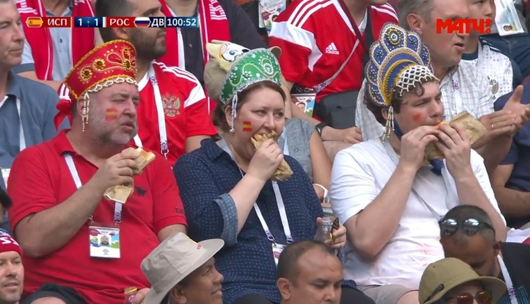 Сборной России по футболу повезло — она не только играет дома, но получает поддержку от самых интересных болельщиков в мире. Особенно выделяется история про троицу болельщиков, замеченных на матче Россия-Испания. Все, кто смотрели прямую трансляцию, могли видеть женщину в окружении двух мужчин, в руках которых были хот-доги, а на головах — кокошники.