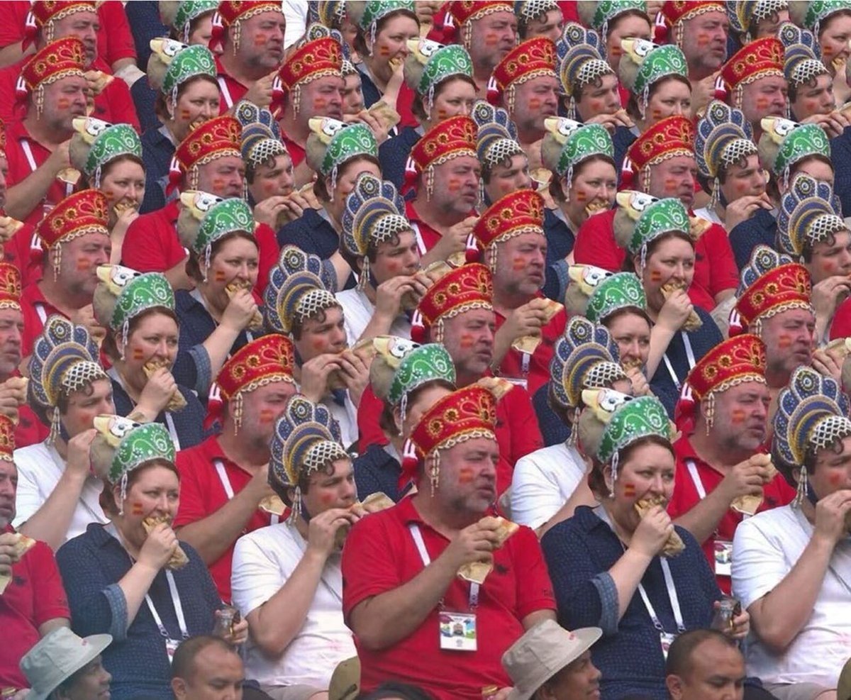 Не менее запоминающимися были наши болельщики в кокошниках, слишком занятые едой, чтобы отвлекаться. «Дождь» быстро сориентировался и расспросил их о наряде.