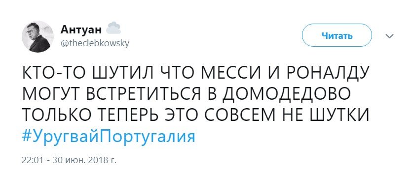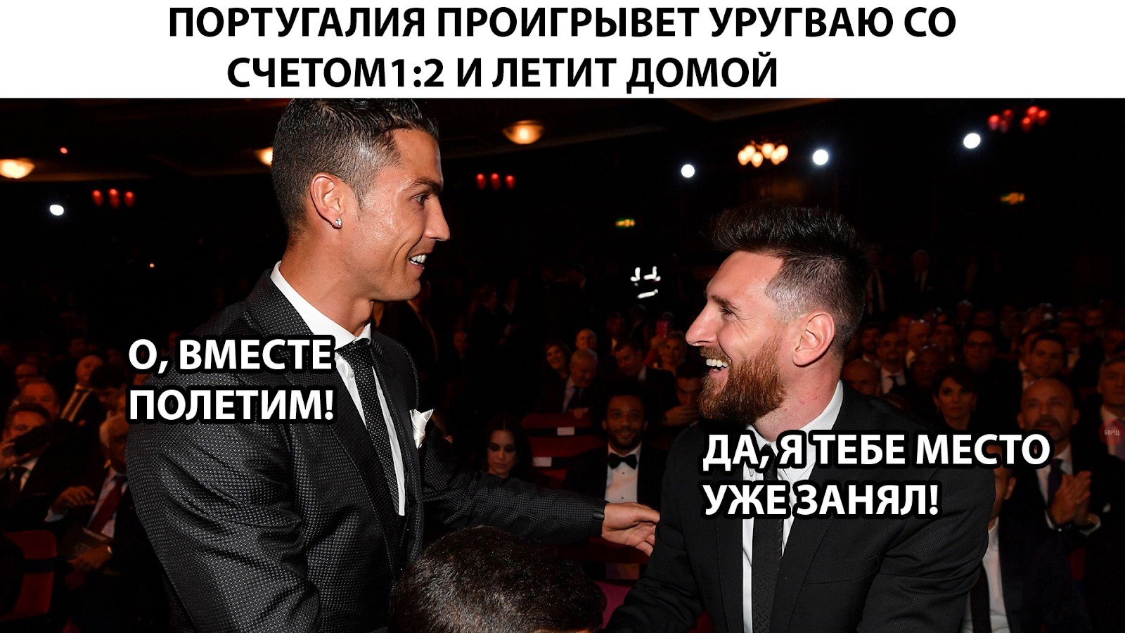 После того, как Португалия с Аргентиной покинули мундиаль в один день, Рунет наводнили шутки про то, как Месси с Роналду, соперники на поле, вдруг вместе отправляются домой. Позже к ним присоединились и футболисты сборной Испании после поражения от России.