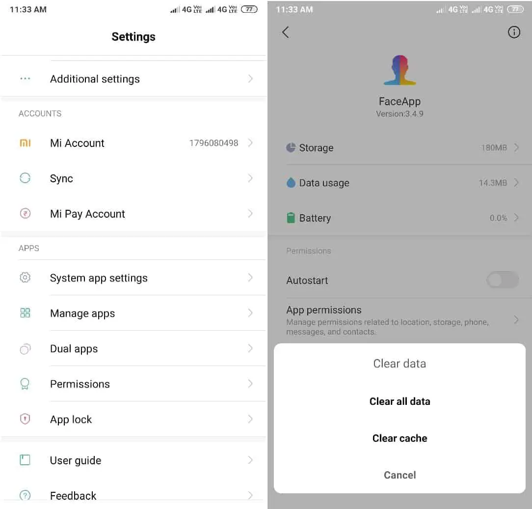 Вы также можете попробовать очистить кэш и данные FaceApp из настроек приложения. Просто выполните следующие шаги и, надеюсь, это поможет решить проблему.