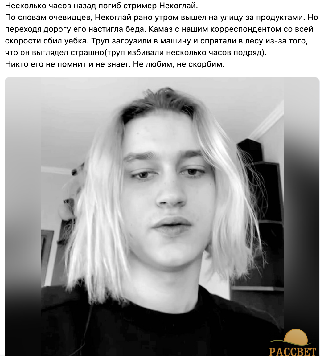 В Сети появилась информация о несчастном случае, который произошел несколько часов назад — стример Некоглай, по словам свидетелей, погиб в результате столкновения с грузовиком, когда он отправился в магазин за продуктами рано утром.