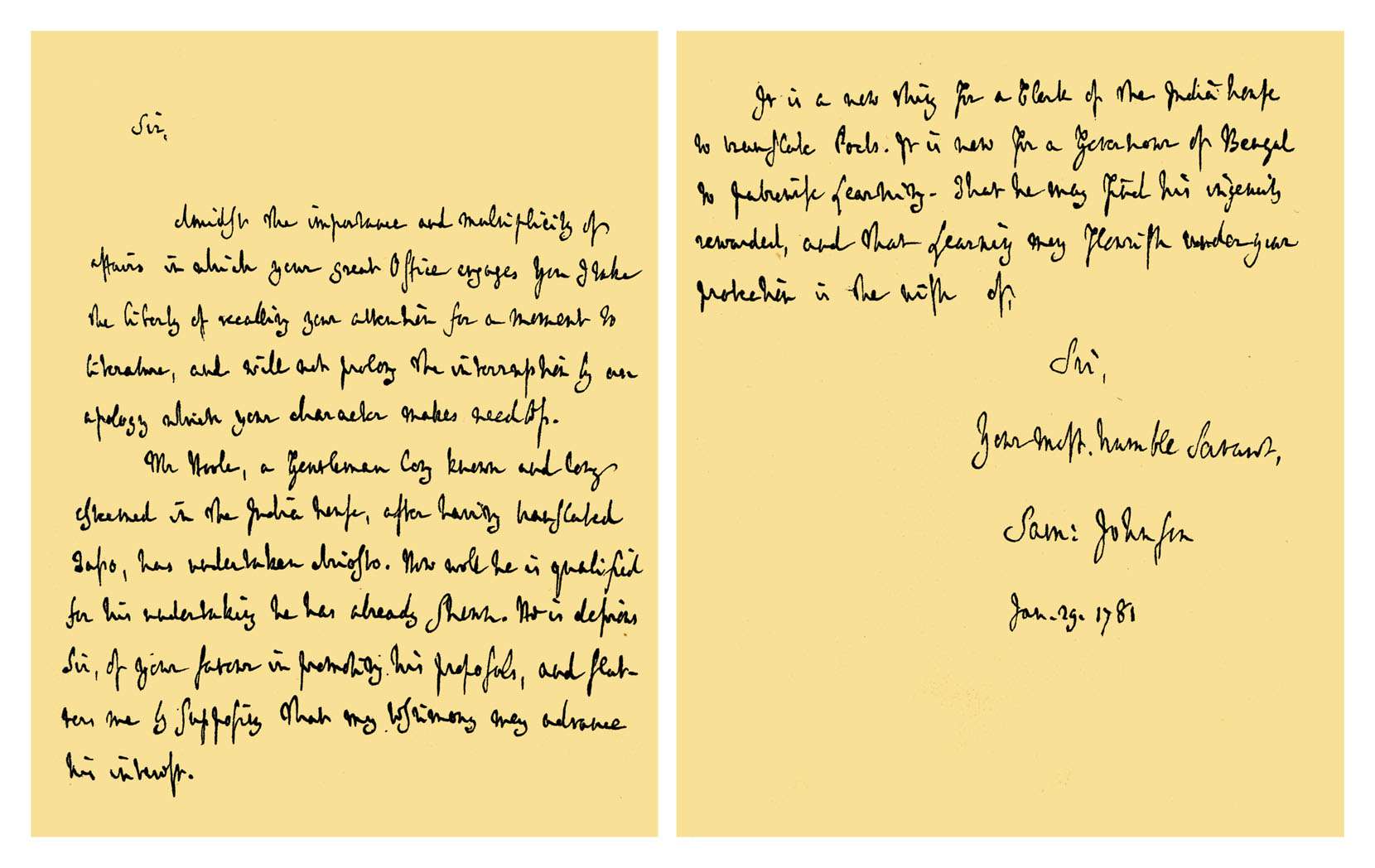 Письмо доктора Сэмюэля Джонсона Уоррену Гастингсу, генерал-губернатору Бенгалии, с просьбой о его поддержке в отношении предполагаемого перевода Ариосто, сделанного Джоном Хулом, аудитором Индийского дома. 29 января 1781 г. Подпись: доктор Сэмюэл Джонсон.