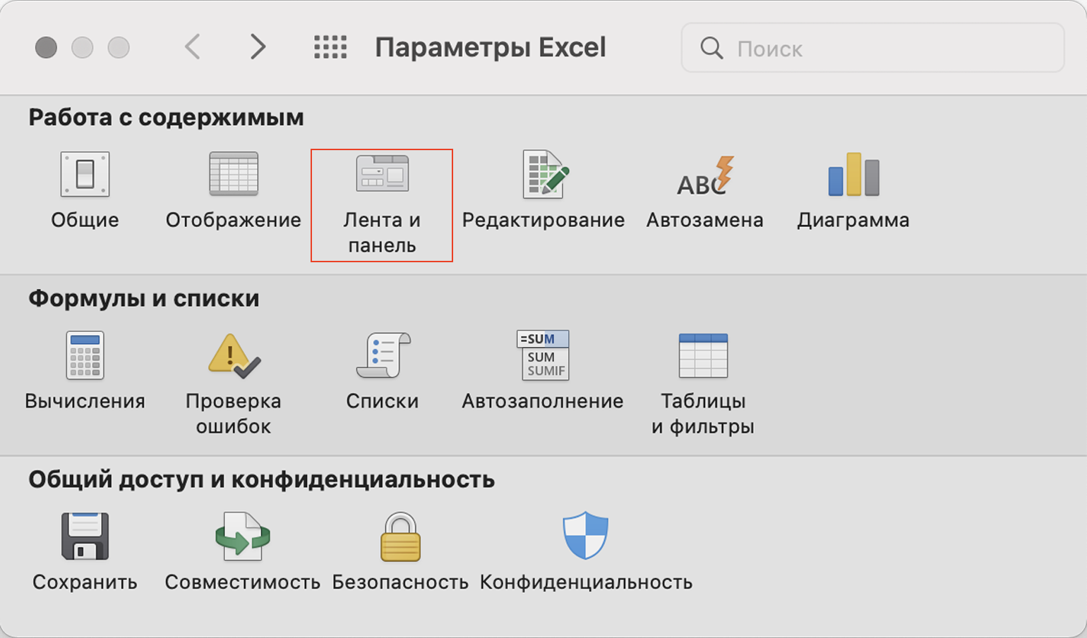 В появившемся окне нажимаем кнопку «Лента и панель».
