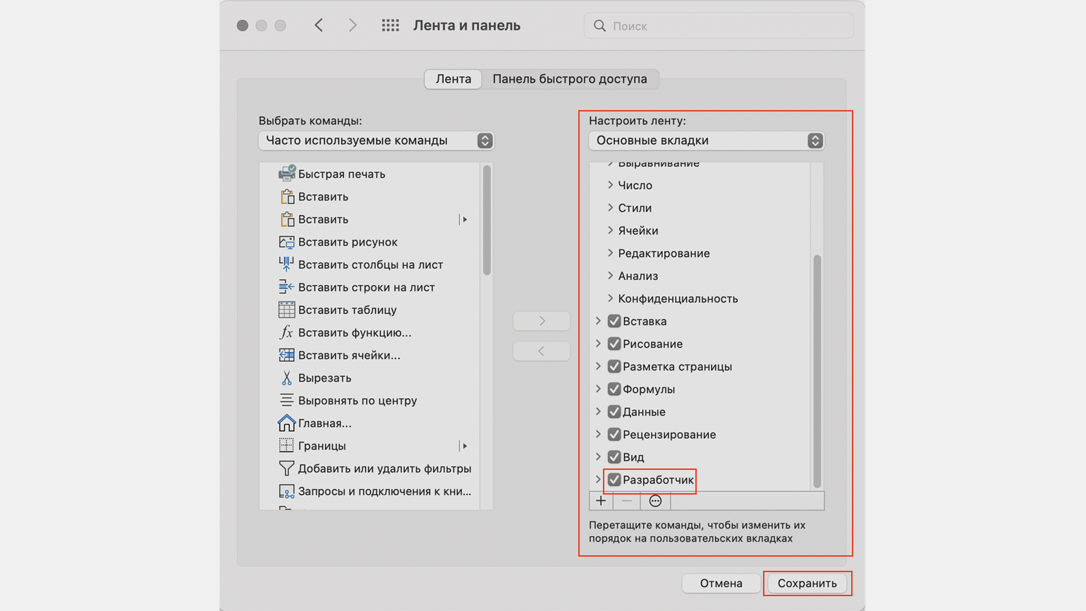 Затем в правой панели «Настроить ленту» ищем пункт «Разработчик» и отмечаем его галочкой. Нажимаем «Сохранить».