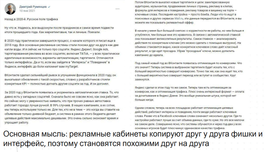 Например, это может быть основная мысль поста. Или части поста, если он длинный. Пример — длинный пост Дмитрия Румянцева. Основная его мысль — рекламные кабинеты копируют друг у друга фишки и интерфейс.
