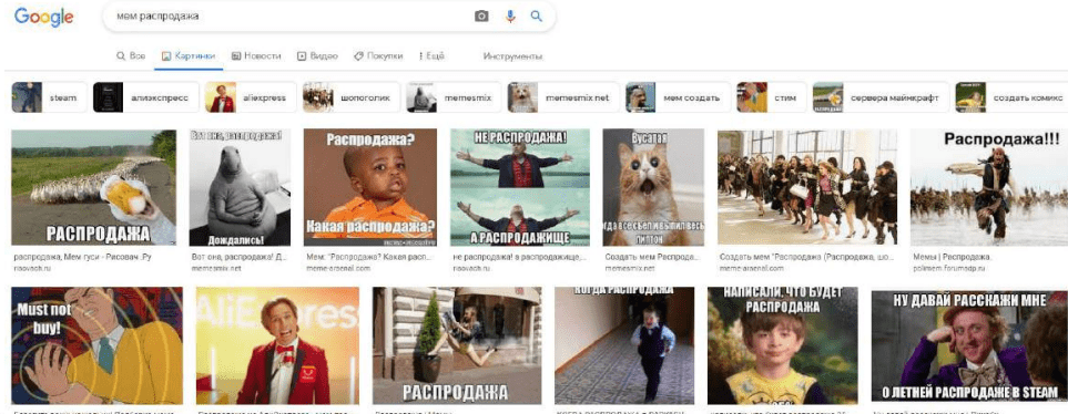 в лоб. Ищем мемы по нашей теме. Например, «мем распродажа».