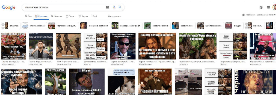 по смежным темам. Например, «мем про чёрную пятницу», «мем про скидки».