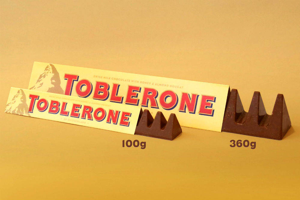Такая скрытая инфляция распространена не только в России, но и в Великобритании, Ирландии и США. Еще один пример — возмутивший многих случай с шоколадками Toblerone. Несколько лет назад компания Mondelez International, выпускающая шоколад, уменьшила плитку (400 граммов, 11 шоколадных треугольников) до 360 граммов. Треугольников осталось всего 9, а промежутки между ними стали больше. Маленькая плитка тоже стала меньше на 20 граммов: со 170 до 150. Британцы пришли в бешенство, назвав новую шоколадку “парковкой для велосипедов” и потребовав от компании ответа.