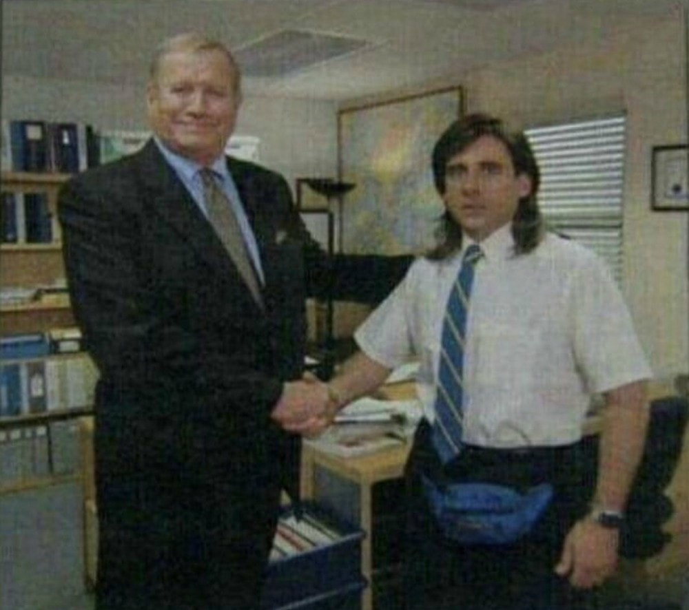 Не менее меметично и рукопожатие персонажа Стива Карелла с начальником: неловкая фотография длинноволосого менеджера с дурацкой синей барсеткой на поясе мелькнула в одной сцене в качестве газетной вырезки. Этого было достаточно, чтобы войти в историю.