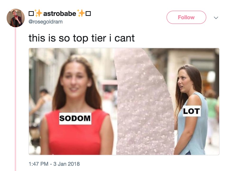 This biblical version of the Distracted Boyfriend meme captured the attention of everyone who remembered how Lot’s wife became a pillar of salt: