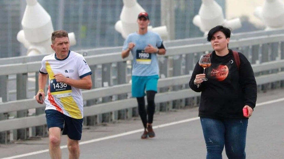 Одно из самых колоритных фото было сделано на Золотом мосту фотографом Вадимом Поповым. Мужчина в своём профиле в инстаграме опубликовал несколько фото местных спортсменов в футболках с номерами, преодолевающих километры дистанции бегом. Однако на их фоне особенно ярко выделилась фигура девушки в джинсах и чёрной толстовке, которая спокойно, никуда не спеша и не пытаясь ничего доказать, вышагивала с большим бокалом вина.