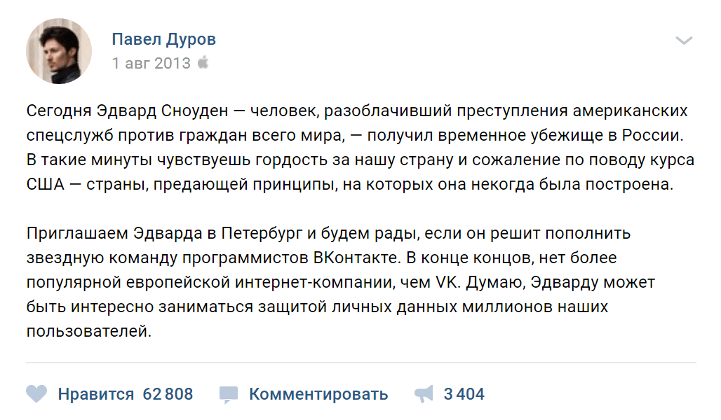 Павел Дуров с 2007 года активно ведет страницу «ВКонтакте» и рассказывает не только о новостях своего бизнеса, но и реагирует на актуальные события или просто делится своими взглядами на жизнь. Например, в 2013 году он осудил борьбу США против Эдварда Сноудена и обрадовался, что Россия предоставила ему временное убежище.