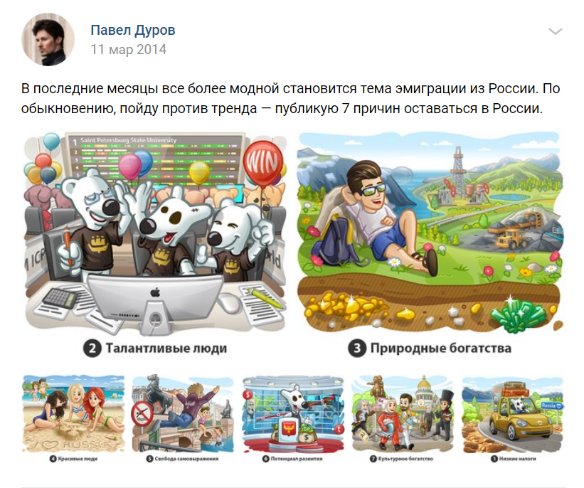 Павел Дуров делился своим видением развития родного Санкт-Петербурга. Бизнесмен, который, как он сам заявляет, сейчас живет за пределами России, публиковал целые списки причин оставаться в стране и не уехать из нее. Жить в России стоит из-за талантливых и красивых людей, природных и культурных богатств, низких налогов, потенциала для развития и свободы самовыражения — так Дуров писал еще в марте 2014 года.