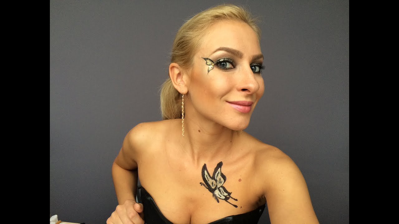 В конце выдели губы и зафиксируй макияж. Вот так ты сможешь создать незабываемый образ с помощью косметики. Правда, стразы или чешуйки придется поискать в специализированных магазинах, но купить их не составит особого труда.