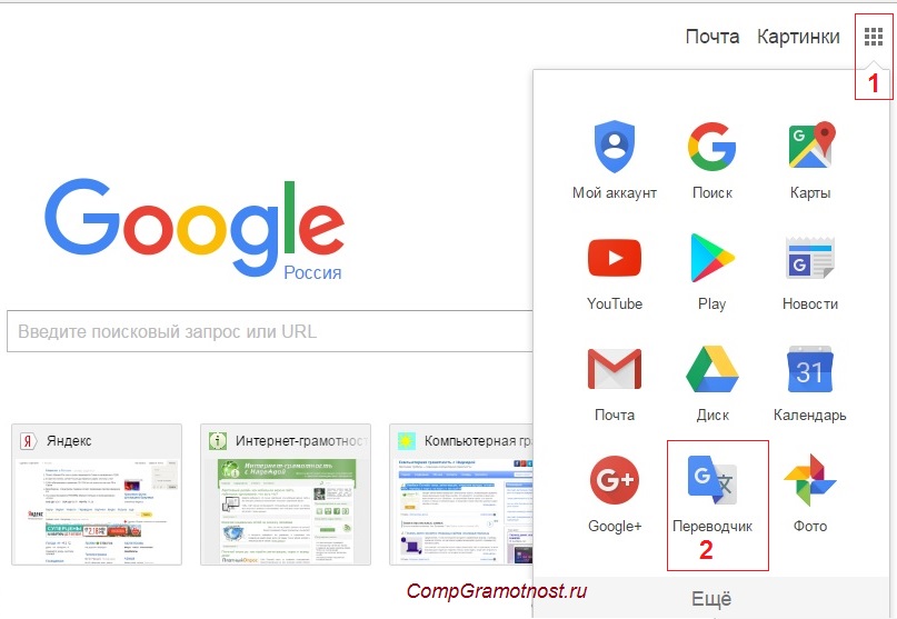 - Цифра 1 на рис. 1 — кликаем по небольшому прямоугольнику из точек, после чего откроются основные приложения Гугла.