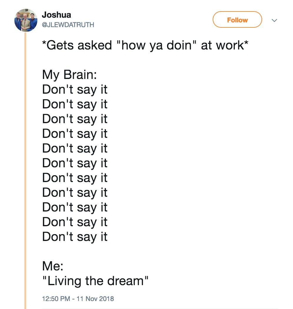 We all have responses to reoccurring questions that are blurted out without much thought. The ‘don’t say it’ meme is all about holding back those responses so we don’t look like fools. Oops, too late.