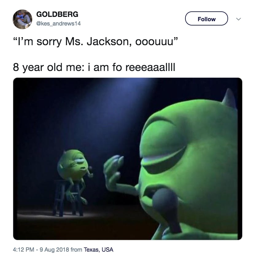 A scene from Monsters, Inc. featuring the one-eyed Mike Wazowski turned into a meme about people singing along passionately to their favorite songs as kids.