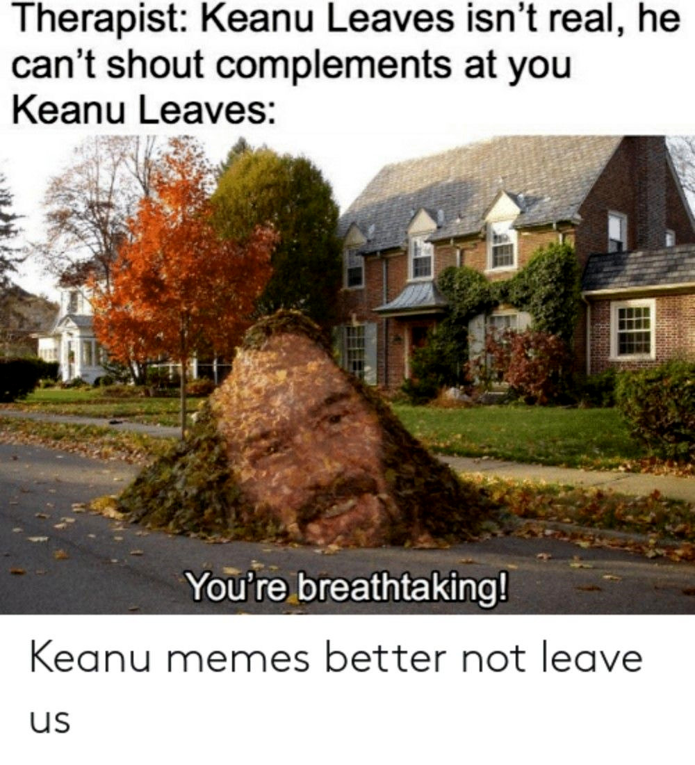 Как Муфаса появляется перед Симбой в скоплении облаков, Киану Листья появляется перед вами в куче листьев. Он передает вам свои слова мудрости, напоминает, что у вас захватывает дух, а затем так же внезапно, как и появился, уносится сильным осенним ветром в поисках другого, кому нужно услышать его ободряющую речь. Вы идете к своему психотерапевту, пытаясь разобраться в том, что вы только что пережили. Вы пытаетесь описать трансцендентность этого, но не можете найти слов. Вы просто знаете, что мемы Киану не могут покинуть нас, потому что мир всегда будет темным и разочаровывающим, и вам всегда будут нужны Листья Киану.