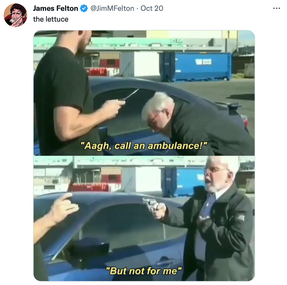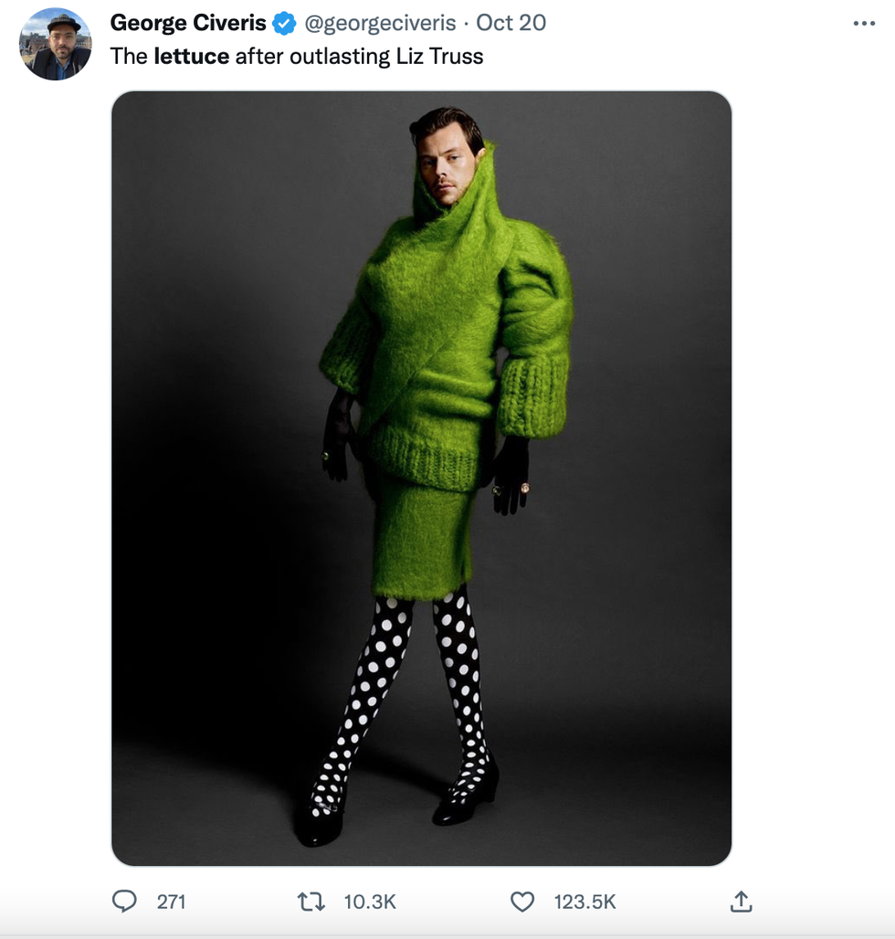 But all the lettuce material came from a leader article in The Economist on 11 October, which opened with one of the all-time great withering political assessments. Just for the sake of posterity, here it is: «Ms Truss entered Downing Street on September 6th. She blew up her own government with a package of unfunded tax cuts and energy-price guarantees on September 23rd. Take away the ten days of mourning after the death of Queen Elizabeth II, and she had seven days in control. That is roughly the shelf-life of a lettuce.»