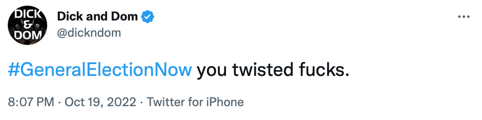 There was chaos in the voting lobby, with the chief whip reportedly resigning on the spot there, then Truss frogmarching her to an office to ask her to reconsider, and in the process not scanning her card to vote in her own confidence vote. Tory MP after Tory MP broke ranks to look opine on how much the party had disgraced itself. (The country? Never heard of her.)