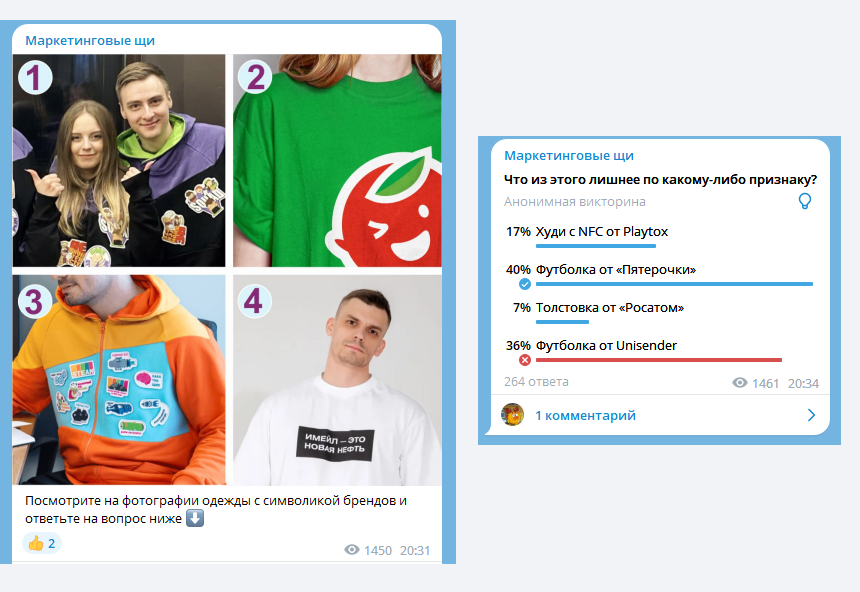 Администратор канала «Маркетинговые щи» вышел из положения: сначала выложил фотографии с пояснением, а затем добавил опрос
