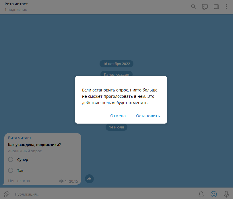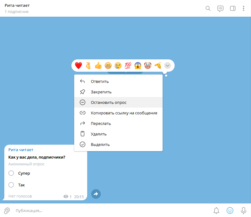 Администратор канала или группы не может редактировать опрос, но может его остановить. Чтобы сделать это с компьютера, щёлкните по посту правой кнопкой мыши и выберите «Остановить опрос». На телефоне нужно просто зажать сообщение.