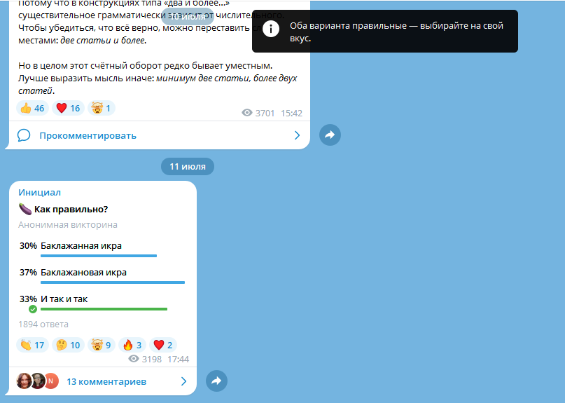 С выбором правильного ответа. Создатели Telegram называют их викторинами. Если пользователь выбирает правильный вариант ответа, он подсвечивается зелёным. Неверный загорается красным. Проголосовать повторно нельзя — разработчики запретили это, чтобы подписчики не смазывали реальную статистику.