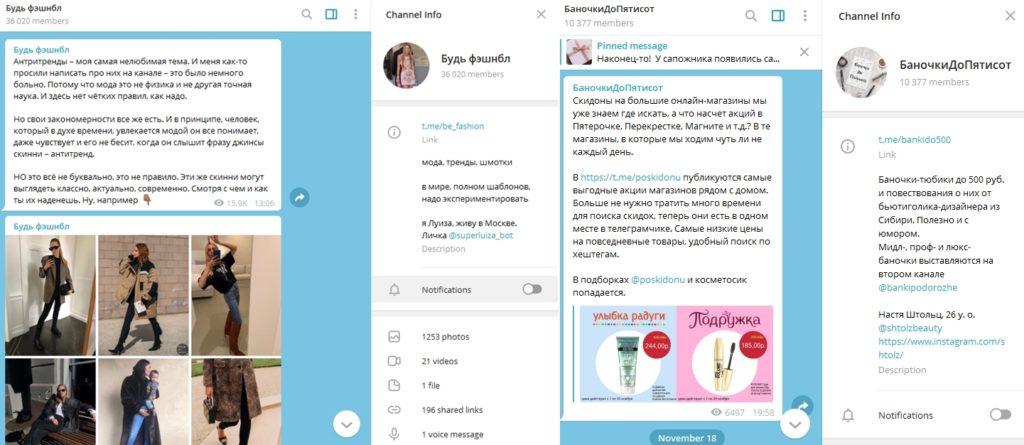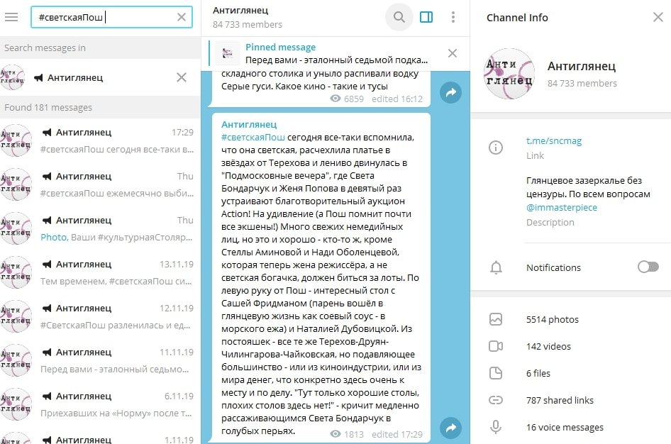 В русскоязычной версии Telegram существует огромное количество каналов, посвященных стилю жизни: моде, гастрономии, путешествиям, гаджетам, кино, музыке, шоу-бизнесу, спорту, звездам и т.д.