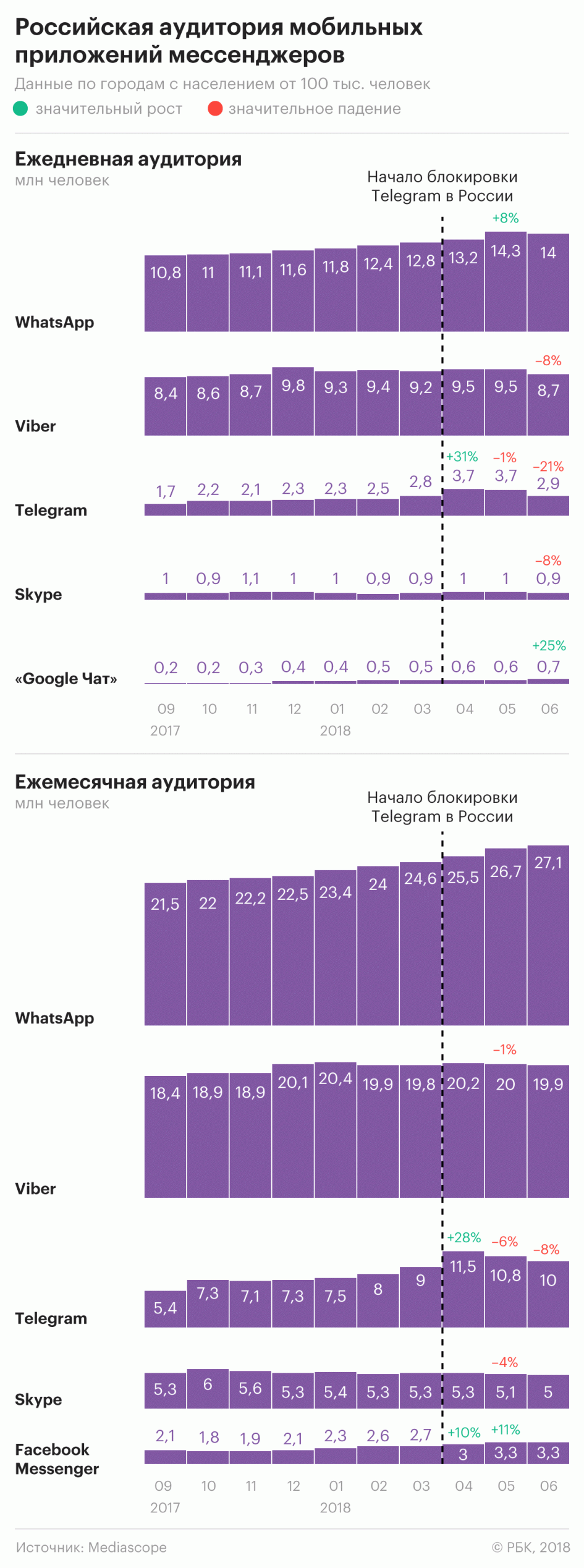 статистике, которую собрала компания Mediascope на июнь 2018, Telegram пользовались в среднем 2,9 млн россиян. В статистику вошли пользователи от 12 до 64 лет, проживающие в городах с населением от ста тысяч человек, которые заходили в мессенджер хотя бы раз в день.