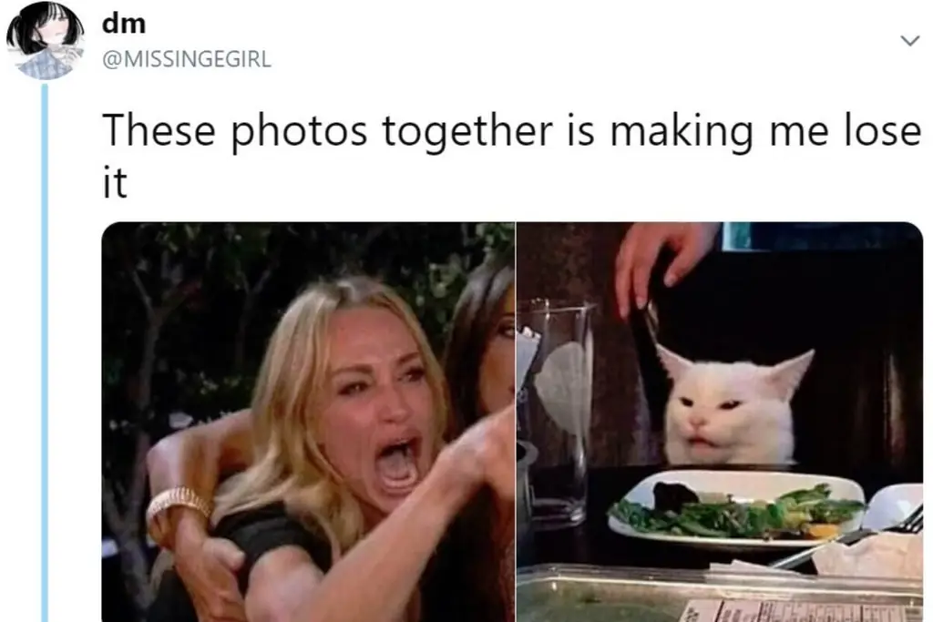 Кто создал это сопоставление изображений? Yelling Cat впервые появился на аккаунте 1 мая 2019 года. Твиттер @MISSINGEGIRL, которая в тот день опубликовала две фотографии с подписью «Эти фотографии вместе заставляют меня терять это» или «Эти фотографии вместе заставляют меня потерять рассудок». И как ее винить!