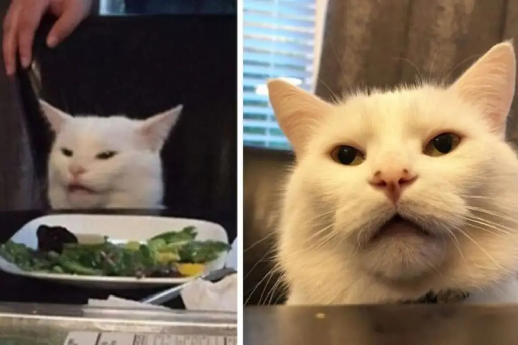 Мем просто безошибочно узнать: на одной стороне изображение одного из них. белокурая женщина плачут и кричат, указывая на кого-то указательным пальцем; с другой, однако, есть один странный белый кот со смешным выражением лица, которое появляется из-за стола перед тарелкой салата, который ему, кажется, просто не нравится.