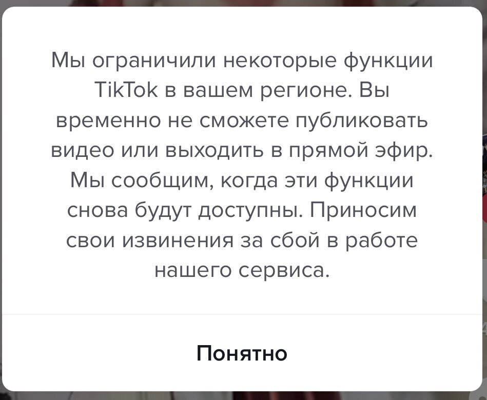 6 марта 2022 года в твитере TikTok появилось сообщение о блокировке некоторого функционала для российских пользователей. В целом, теперь нельзя опубликовать новые видеоролики. И нельзя смотреть видео зарубежных тиктокеров.