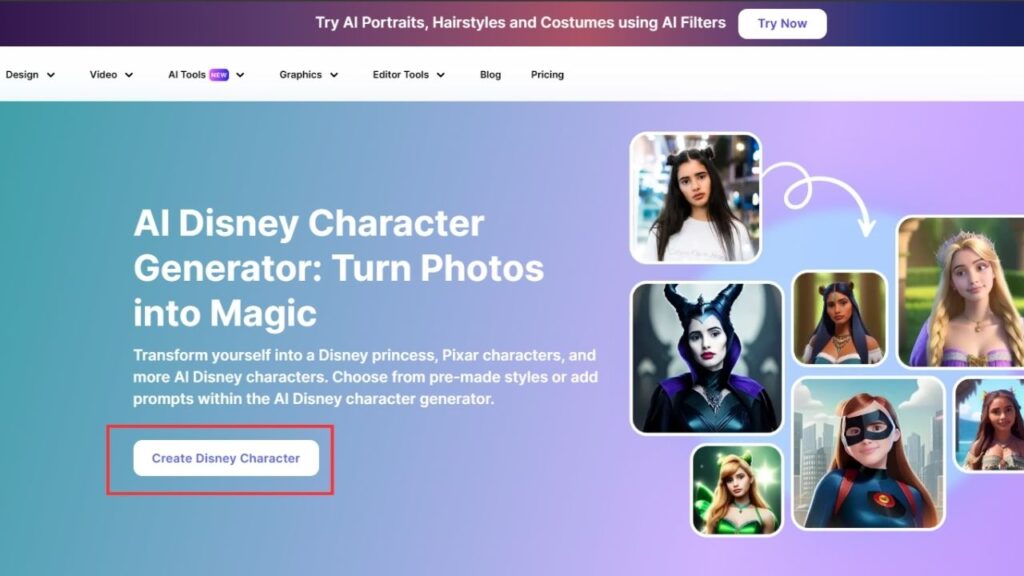Go to the LightX AI website or App. Click on “Create Disney Character” in the top menu.