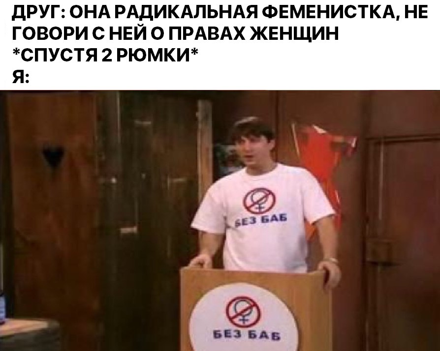 Февраль — это «Без баб», общество, основанное Геной Букиным в сериале «Счастливы вместе». Предположительно, мем получил такую популярность спустя 12 лет после выхода сериала из-за движения #metoo.