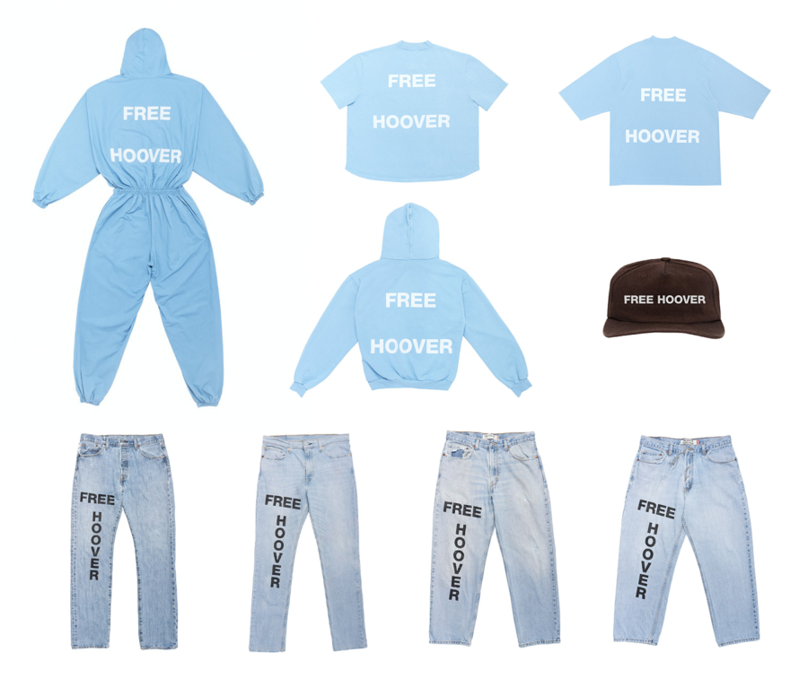 В коллекцию вошли худи, комбинезон и футболка нежно-голубого оттенка, а также джинсы и коричневая бейсболка. На каждом айтеме белым цветом написана фраза «FREE HOOVER». На сайте сказано, что производством мерча занимался бренд Balenciaga.