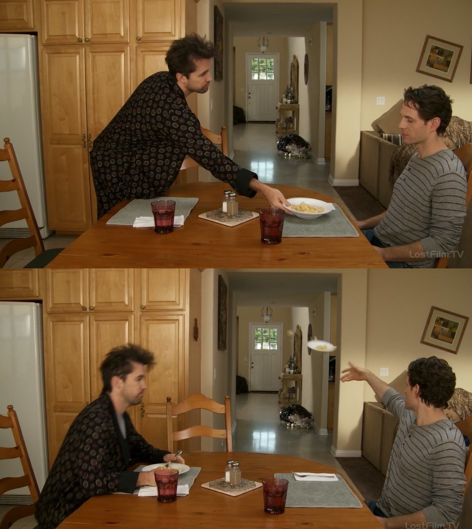 Сериал, полный абсурдных ситуаций и юмора в шаге от гильотины культуры отмены, в принципе оброс целым фандомом, который кропотливо архивирует самые меметичные его моменты. Например, по сети разошлись кадры с одним из персонажей, который широким взмахом отбрасывает тарелку со стряпней друга. Деннис просто устал жить в пригороде и каждый день есть одни и те же макароны с сыром, но фантазия пользователей применяет изображения для самых разных шуток.