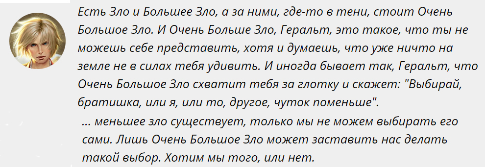 Историей в Блавикене Сапковский хотел показать банальную истину: мы не всегда свободны в своем выборе, иногда из нескольких плохих вариантов приходится останавливаться на наиболее приемлемом. Это и есть меньшее зло. От него сложно отказаться, так как выбора по сути и нет.